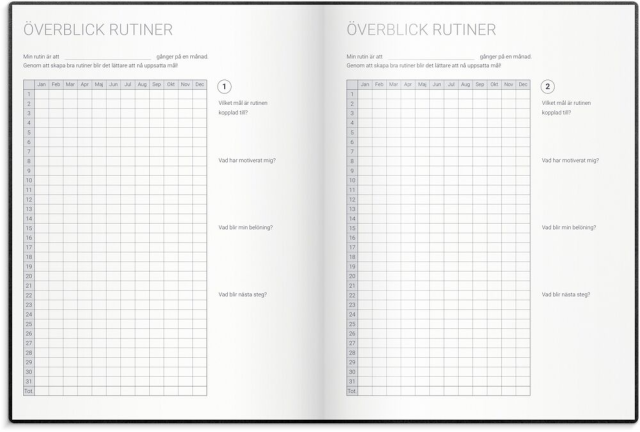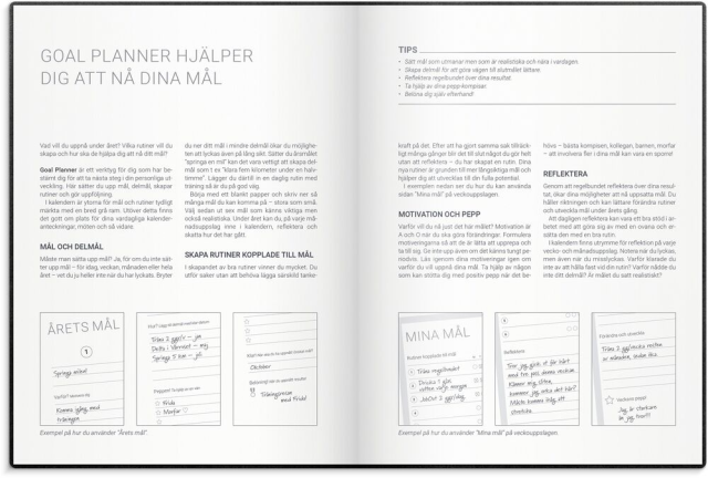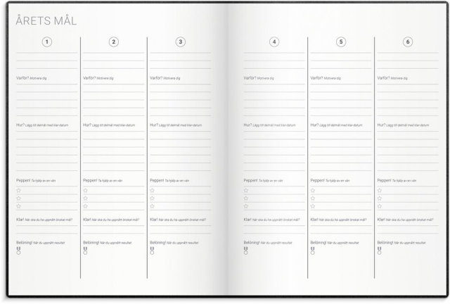 Att sätta upp mål, kämpa och slutligen lyckas är en rejäl boost för självkänslan! Oavsett vad du vill åstadkomma eller förändra är Burdes Goal Planner din optimala stöttepelare längs vägen. Du får hjälp med delmål, reflektioner, belöningar och din dagliga planering, såklart. Kalendern har ett stilrent omslag i svart konstläder med gummiband och märkband.
