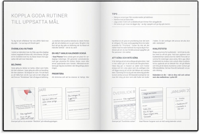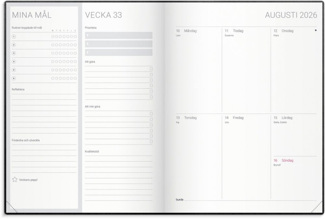 Att sätta upp mål, kämpa och slutligen lyckas är en rejäl boost för självkänslan! Oavsett vad du vill åstadkomma eller förändra är Burde s Goal Planner din optimala stöttepelare längs vägen. Du får hjälp med delmål, reflektioner, belöningar och din dagliga planering, såklart. Kalendern har ett stilrent omslag i svart konstläder med gummiband och märkband.? Format: 195x260 mm? Layout: Vecka/uppslag? Kalendarium: 2025-12-29 - 2027-01-03? Omslag: Konstläder. Inbunden? Detaljer: Gummiband. Märkband? Innehåll: Flaggdagar, Helgdagar/aftnar, Månfaser, Namnsdagar, Temadagar/händelser, Årsöversikt/årsöversikter, Årsplan/årsplaner? Antal sidor: 160? FSC Mix