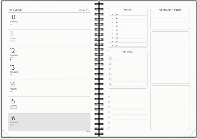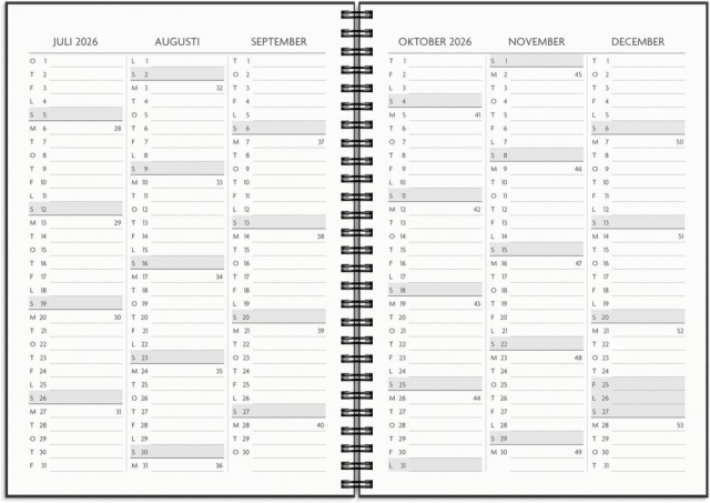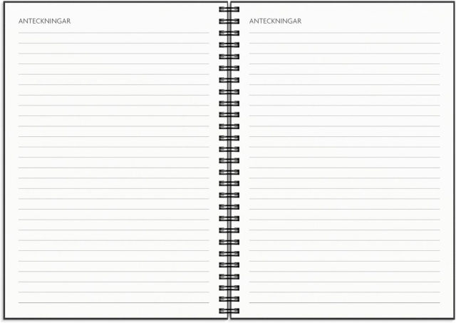 Format: A5. Layout: Liggande. Vecka/uppslag. Kalendarium: 2025-12-15 - 2027-01-03. Omslag: Kartong med struktur. Spiralbunden. Detaljer: Gummiband. Pappersficka. Innehåll: Flaggdagar, Helgdagar/aftnar, Månfaser, Namnsdagar, Internationella helgdagar översikt, Temadagar/händelser, Årsplan/årsplaner. Antal sidor: 144. Miljöinformation: FSC®. -