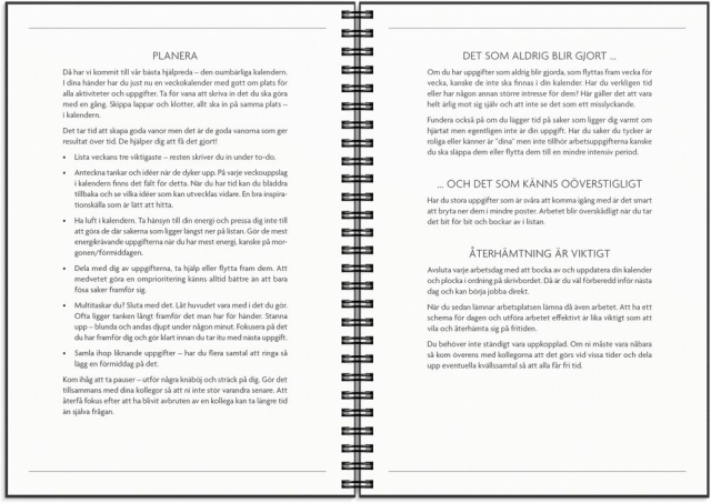Det är kombinationen analogt och digitalt som kan bidra till de kraftfullaste insikterna. Få det Gjort är en smakfull kalender med bra möjlighet att komplettera dina redan existerande tekniska lösningar eller fördjupa strukturen när du väljer att verka off-line. A5 kalendern har veckouppslag med hela veckan i en horisontell layout på vänster sida och till höger finner du olika listor för inköp, prioriteringar och möten. Allt i en vacker gråskalig formgivning. Lägg till ett stilfullt omslag eller uppskatta den stilrena svart/vita designen precis som den är. Med Få Det Gjort sätter du reglerna!