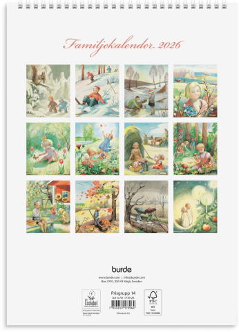 FamiljeFormat: A4. Layout: Månad/blad. Kalendarium: 2026-01-01 - 2026-12-31. Spiralbunden. Innehåll: 4 kolumner, Flaggdagar, Helgdagar/aftnar, Månfaser, Namnsdagar, Temadagar/händelser. Antal sidor: 12. Miljöinformation: FSC®. Ecolabel. -