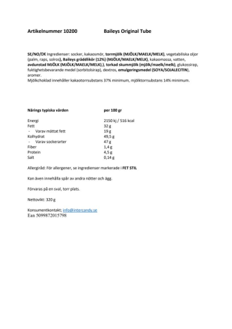 - Information Chokladtryffel med fantastisk fyllning smaksatt med äkta Baileys Original Cream likör. Vikt 320 g.