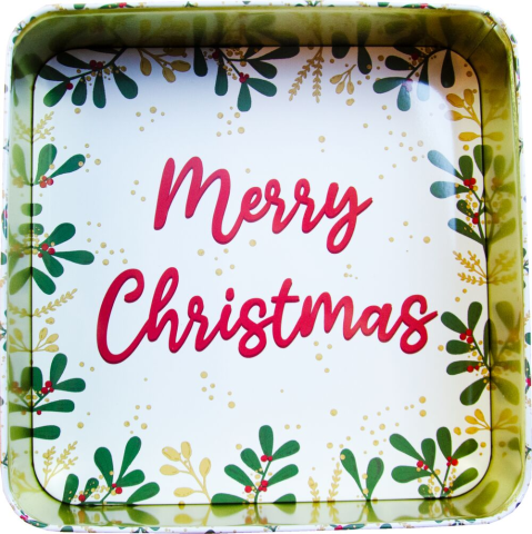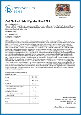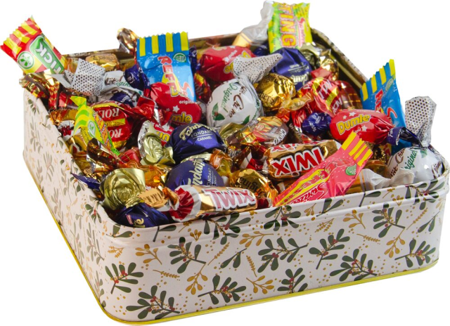 - Information Julig dekorativ plåtlåda med ett fönster som visar det goda innehållet. När det goda tar slut finns där en trevlig julhälsning i botten. Innehåller: Dumle, - Twix, - Werther?s Original Creamy Toffee, - Werther?s Original Toffee, - Choko Original Toffee, - Refreshers, - Elvan Fondanté Chocolate, - Nötcremé Original, - Rollo kola.