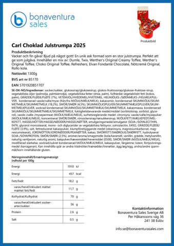 - Information En unik ask formad som en stor julstrumpa. Perfekt att ge som julgåva. Innehåller: - Dumle, - Twix, - werther?s,riginal Creamy Toffee,- Werther?s Original Toffee,- Choko Original Toffee,- Refreshers,- Elvan Fondanté Chocolate,- Nötcremé Original, - Rollo kola.