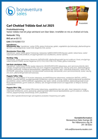 - Information Vacker trälåda med ett juligt satinband som låser lådan. Innehåller: - Aroma skumtomtar 90 g, - Aroma Skumtomtar Choklad 80 g, - Poppets Toffee 130 g, - Poppets Mint 130 g, - Narr Saltlakritskula 100 g, - Marabou nonstop 150 g.