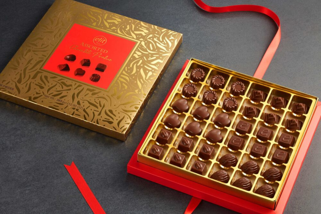 - Information En röd och gyllene chokladask med rosett, innehållande goda chokladpraliner.