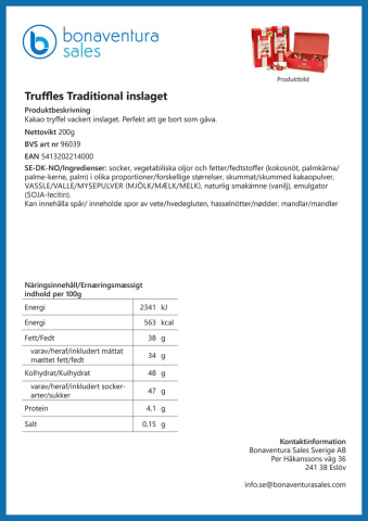 - Information Belgiska tryfflar insagna i rött presentpapper.